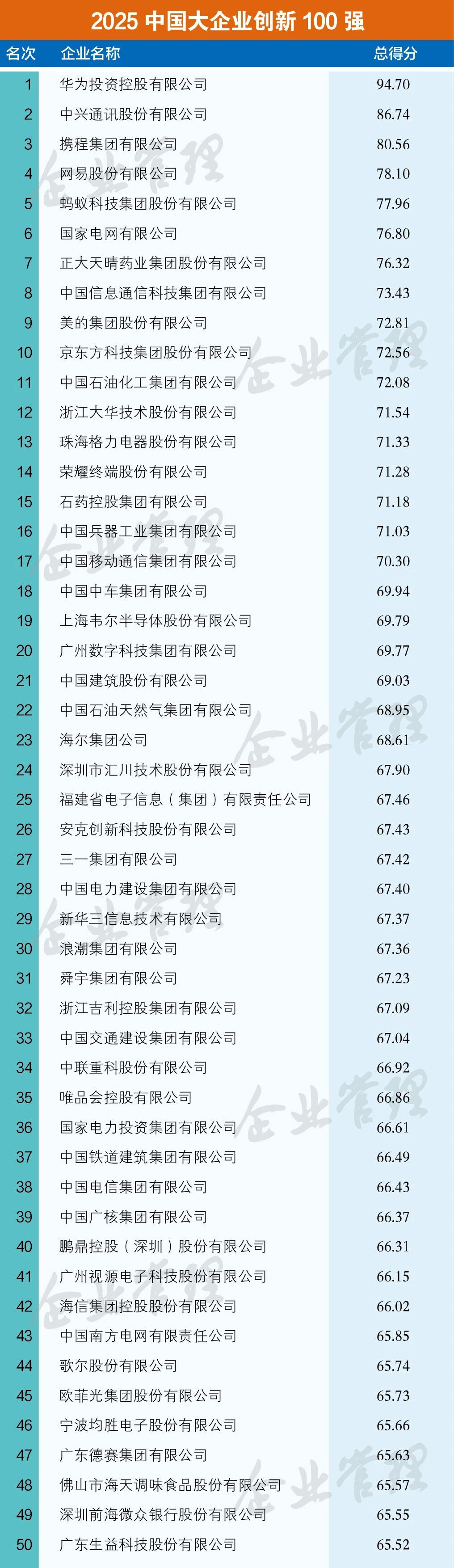 榜单显示,华为投资控股有限公司以94.70分的总得分位居榜首,领跑创新榜单;中兴通讯(000063)股份有限公司、携程集团有限公司分别以86.74分、80.56分位列第二、三名;网易股份有限公司、蚂蚁科技集团股份有限公司分别以78.10分、77.96分跻身前五。