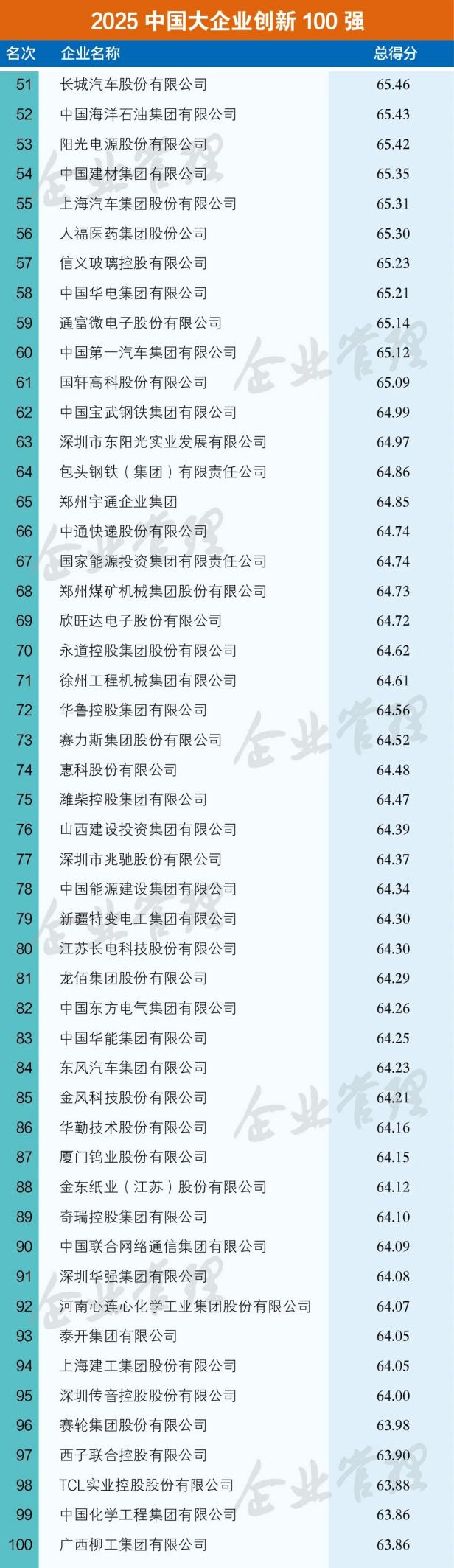 上证报中国证券网讯(记者 王墨璞嘉)9月15日,中国企业联合会、中国企业家协会发布“2025中国大企业创新100强”名单。